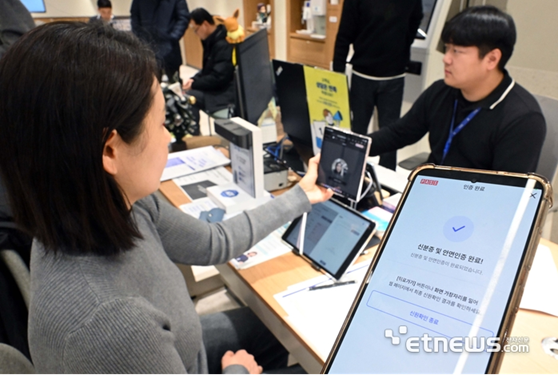 사진 = 서울 한 이동통신사 대리점에서 고객이 안면인증 본인인증을 통해 휴대전화 개통을 하고 있다. 김민수 기자 smkim@etnews.com