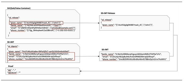 SD-JWT(Selective Disclosure JSON Web Token)는 사용자가 필요한 정보만 선택적으로 공개할 수 있도록 설계된 JWT 확장 규격으로, IETF OAuth 워킹그룹에서 표준화를 추진 중이다. 영지식증명(ZKP)은 데이터를 전혀 공개하지 않고 증명이 가능하나 복잡한 암호 연산으로 연산부담이 발생하는 반면, SD-JWT는 서명된 JWT와 해시 증명 구조를 사용하여 경량성과 실용성을 확보했다. '부분 공개형 프라이버시 보호 모델'로서 효율성과 개인정보 보호 간 균형을 달성하고 있다.