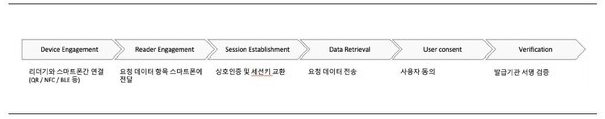 ISO/IEC 18013-5는 mDL 및 mDoc의 리더-지갑 간 통신 프로토콜과 세션 보안 메커니즘을 정의하는 국제표준이다. 물리 카드의 시각적·기계적 검증을 대체하기 위해 BLE, NFC, QR 등 근거리 무선통신 채널이 규격화되었다. 통신은 세 단계로 구성되는데, 먼저 Reader Engagement 단계에서 검증자가 리더 장치에서 QR 코드나 NFC 태그로 세션 개시 정보를 제공하고, Device Engagement 단계에서 지갑이 리더의 세션 정보로부터 안전한 통신 채널을 수립하며 상호 공개키 교환(ECDH)으로 세션 암호키를 생성한다. 마지막으로 Session Data Exchange 단계에서 리더가 DeviceRequest를 전송하고 지갑이 서명된 mDL 데이터셋을 DeviceResponse로 반환하며, 데이터는 CBOR/COSE 구조로 인코딩되고 발급자 전자서명으로 보호된다.