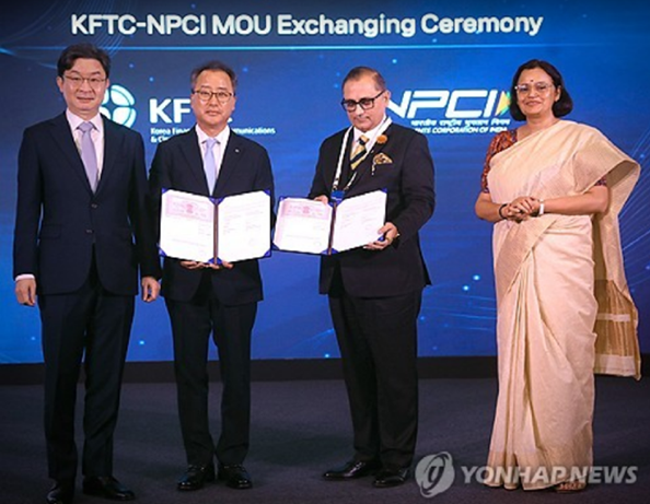 이억원 금융위원장과 아누라다 타쿠르 인도 재무부 차관(오른쪽)이 임석한 가운데 채병득 금융결제원장(왼쪽 두 번째)과 아누브하브 사르마 NIPL 부사장(왼쪽 세 번째)이 지난 20일(현지시간) 인도에서 '한-인도 QR 결제연동 MOU'를 교환하고 있다.