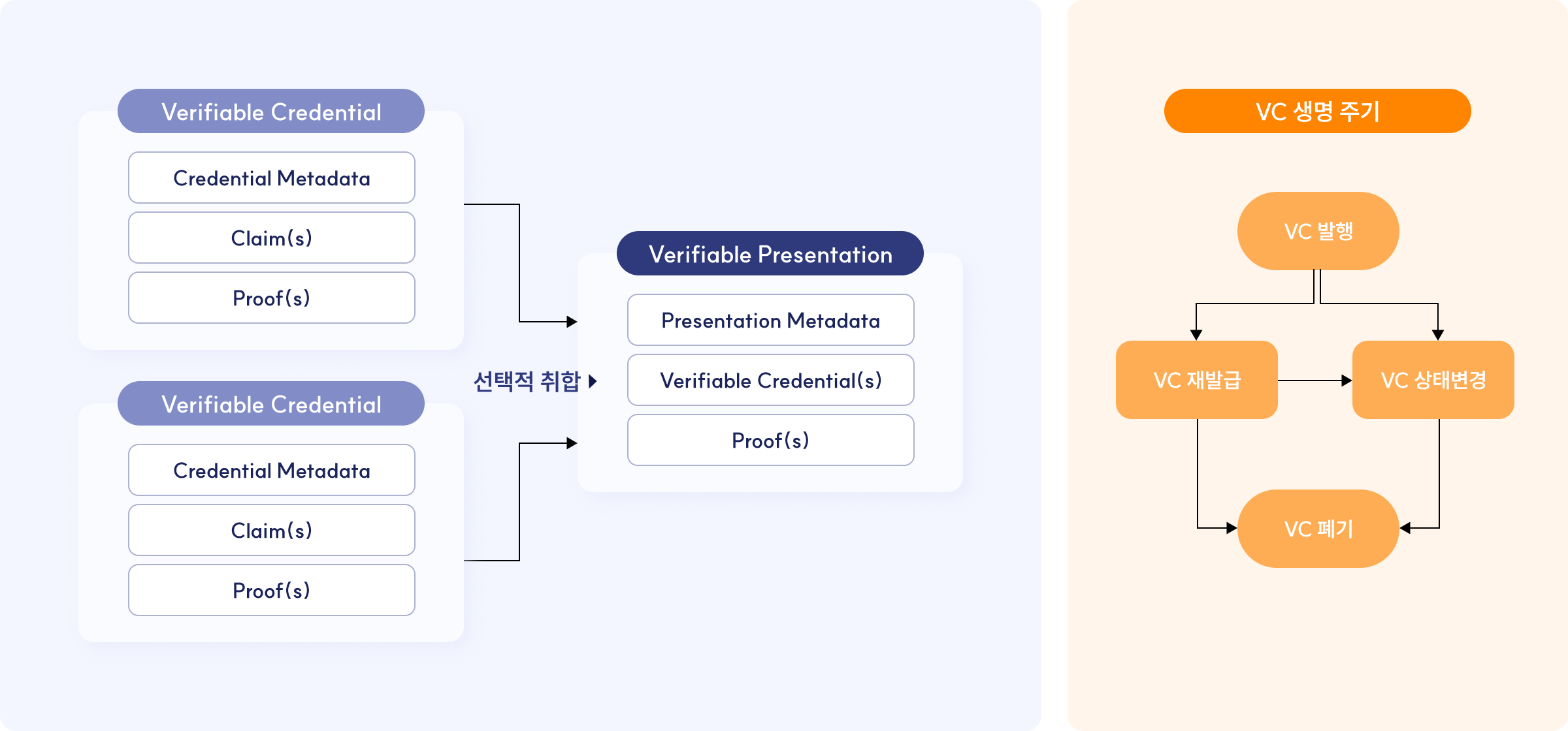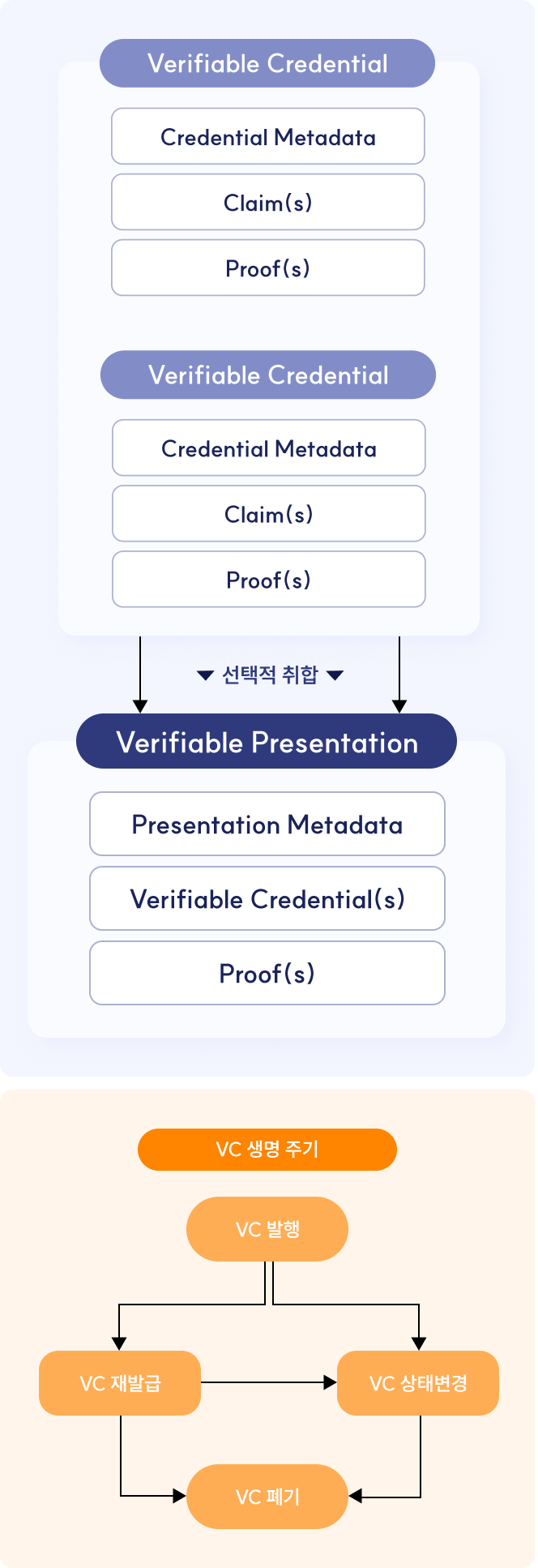 또한, 증명서를 구성하는 Decentralized Identifier와 Verifiable Credentials 간 관계성, 증명서에 대한 생애주기 관리 방안 등을 정의합니다.